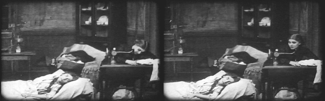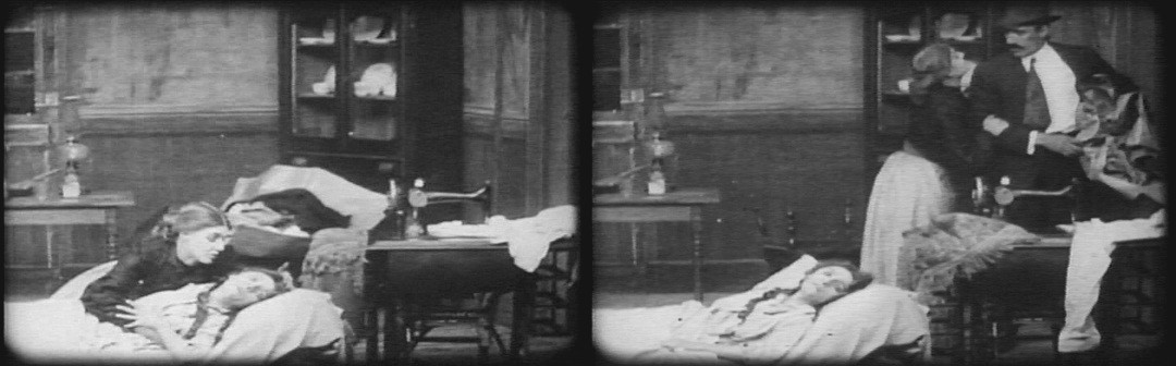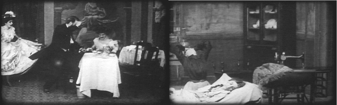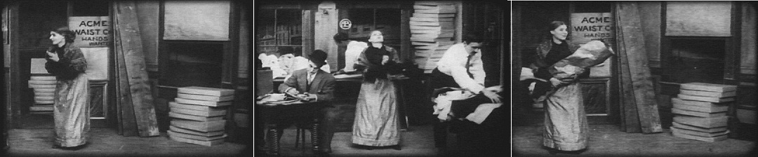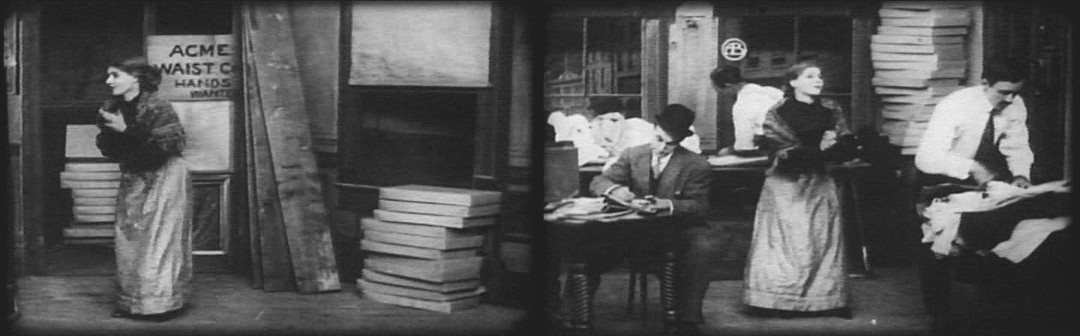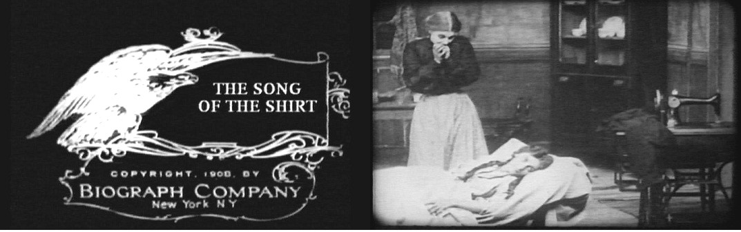 Much more is to be said about Florence Lawrence at Biograph, but given the timing of the 100th anniversary of the Triangle fire, there is another film with Ms. Lawrence in the lead role, one that I think is her earliest “breakthrough” role, and one highly appropriate for this grim anniversary. It is “The Song of the Shirt,” a Biograph film directed by Griffith, photographed by Billy Bitzer, loosely based on a poem of the same title by Thomas Hood. Shot in late October, 1908, released in November, it is halfway between a split-reel and a one-reel in length. Within this limitation it reduces to its essence a story of the plight of garment workers and unmarried, unemployed women in general in New York City at the turn of the 20th century.