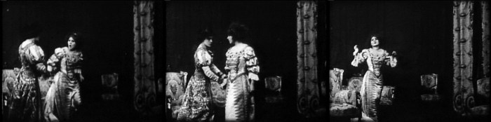 Although this sequence from "The Cardinal's Conspiracy," 1909 (with Florence Lawrence at right in the first two frames with an unknown actress at left), seems in these stills to be nothing more than a filmed stage play. However, the motion of just one or two figures, set against a darker background, prevents the scene from being static. Also, the curtain in the far right of each of these three frames adds another element, seemingly a passive element at first, will shortly serve to introduce another character (Frank Powell) who is observing the scene from the "sidelines."