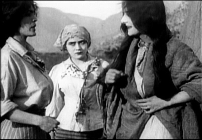 Griffith makes full use of this “power trio,” Claire McDowell, Mary Pickford and Dorothy Bernard, to propel the plot and the weird interaction among the “Female of the Species,” shot in California in 1912, and one of Mary Pickford’s final Biograph appearances.  As McDowell and Bernard fill the space nearest the camera,  Griffith uses Pickford who is slightly further back in the field to “comment” on the action as she reads the others’ expressions and emotions, shifting her gaze back and forth from one to the other of the two women in the near ground of the scene.  The effect this has on us as viewers is to focus our attention on Pickford even though she seems at first glance to be a passive element in the composition