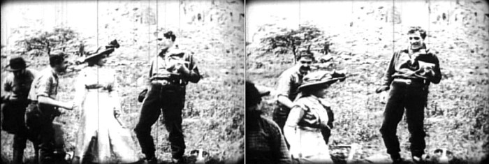 Immediately BELOW, the sun peeks out into the faces of the new “couple,” Sennett and Marion Leonard, perhaps giving Bitzer a visual idea for the ending — to shoot the film’s final scene with his camera facing the waning light and his actors in near-sillouette.