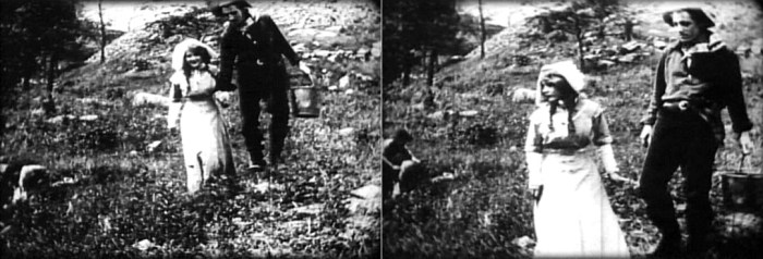 In the three sets of images BELOW, The use of a diagonally staged scene is something Griffith returned to again and again, with hills or mountain meadows providing the “slant” that is reflected in the composition of the characters, as in several scenes from “Renunciation,” 1909, with Mary Pickford, Harry Solter and James Kirkwood: