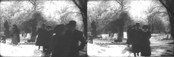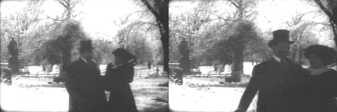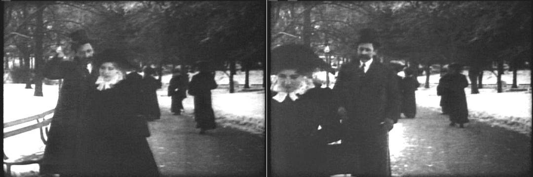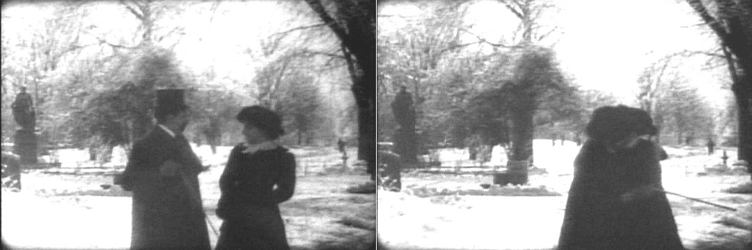 While their faces in near-sillouette are not as distinct as they appeared in the park scenes shot earlier in the afternoon, the softer focus works well against the bright snow and ice-covered landscape.  In this sequence, our couple emerges out of a mass of other couples, not distinct at first, and it is easy to confuse who is who until the final seconds (as seen in the last two sets above).  Some historians have debated whether or not the couple is being shown years later and much older, reminiscing about their first meeting.  The shots just preceding the above (some of which you can see in the first set of the three above) do show one of the elderly couples (played by Anita Hendrie and David Miles) that Sennett had encountered earlier in his stroll in the park, which may be the source of some of the confusion.   But by isolating these still frames, it is pretty clear to me that the entire scene takes place the same day, time and place, with the same newly bonding couple who had only hours earlier been such an unlikely match.  So who needed dating services in 1909 anyway (they did have “matchmakers,” though)?  A stroll on a beautiful snowy day would do just fine.