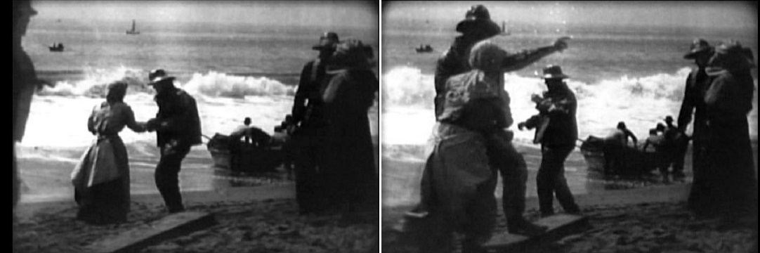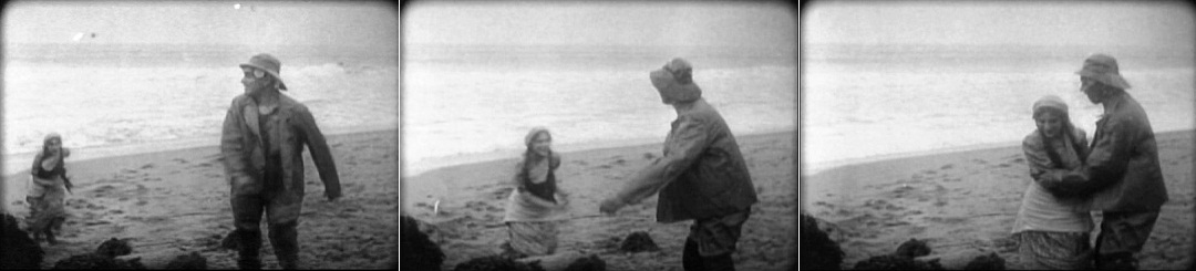 Arthur Johnson and Linda Arvidson Griffith explore the beach at Santa Monica while Director D.W. Griffith and cinematographer G.W. "Billy" Bitzer explore the cinematic possibilities of 35mm "motography." From "The Unchanging Sea," Biograph, March 1910, during the Company's first California trip.