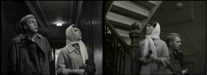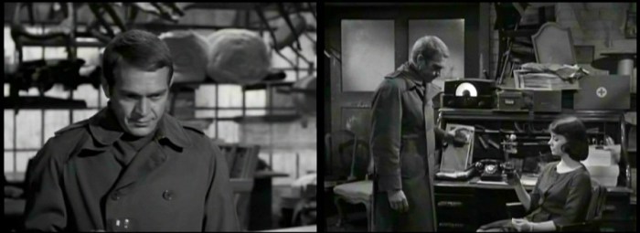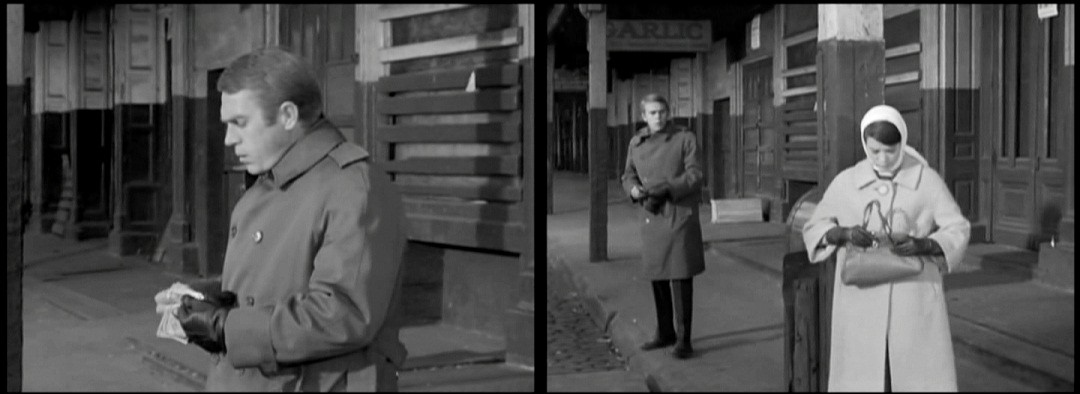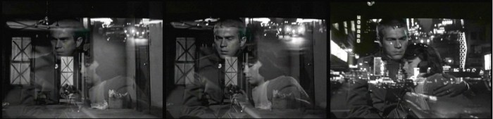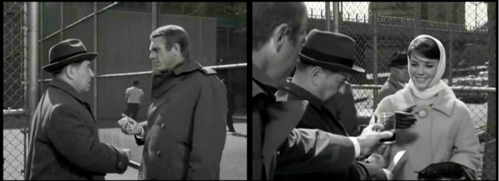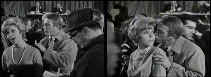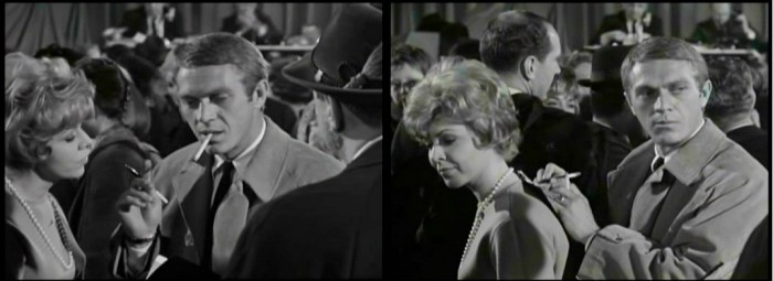 A capsule personality portrait of Rocky Pappasano (Steve McQueen, in “Jean-Paul Belmondo mode”), an irresponsible, womanizing musician looking for work at the musicians’ union hiring hall.  Rocky takes full advantage of women — all of whom seem unable to resist his charms.  He encounters an old acquaintance, Marge (played by adorable character actress Arlene Golonka, uncredited here, but a familiar face in film and television in the 1960’s and 70’s), who allows him to use her back literally, to jot down info on a gig, and a quick peck on the cheek as thanks.
