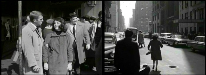 Excellent question. Love With the Proper Stranger was shot on location in Manhattan in 1962, and I’ve identified the location of every exterior shot in the film . . . except one! This particular sequence, the very first in the film, begins inside the musicians’ union hiring hall, and ends with an exterior set-up ostensibly outside the entrance of the union hall, and out onto the sidewalk where Angie breaks away from Rocky and runs across the street. Although I’ve never given it much thought, it appeared to me to be a typical crosstown street in Midtown Manhattan, which could place the likely location as any of the one-way, east-west streets between 31st and 59th Streets.