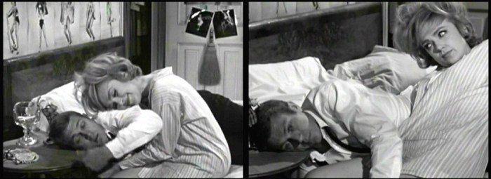 Rocky lives with his current girlfriend, Barb, a stripper (“Barbara of Seville,” a female matador routine, we suppose, played by the delectable, underrated and underutilized Edie Adams).  Barb:  “You know me in the cold weather.  I love to be in love.”  Rocky: “Yeah.  You with yourself, me with myself.”