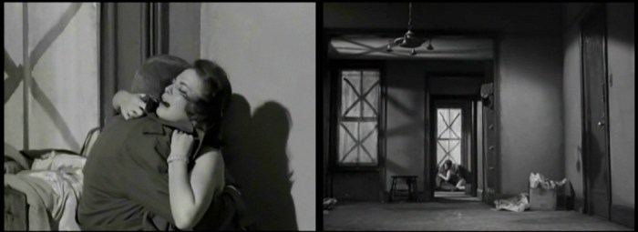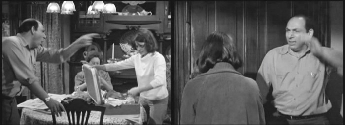 and the fight results in her half-hearted (and probably not her first) attempt to leave (“Don’t love me so much, I can’t breathe!”) the apartment she shares with her widowed mother and her three brothers, the eldest (Herschel Bernardi) of whom acts as surrogate father.  But later (Below), she quietly returns home.