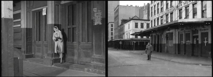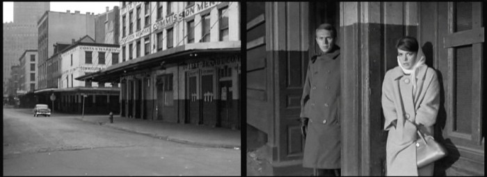 [NOTE (September 2018):  This sequence of Rocky and Angie waiting for the abortionist’s “fixer,” was shot at the former Washington Market on the west side of lower Manhattan in an area of Washington Street that, along with these structures, was demolished in the mid-Sixties.  For more information about this location, and a comparison of historic photos of  the site with still frames from the film, see the Addenda at the end of this essay.]
