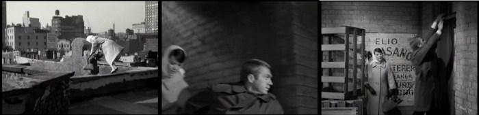 . . . over rooftops, and down into the cellar of a building occupied by the upholstery business of Rocky’s father, where he finds the key . . .  [Note:  the rooftops over which Rocky and Angie scramble to eventual safety are overlooking the Con-Edison Building on East Fourteenth St., apparently another leg of this Manhattan “marathon” for the star-crossed couple!]  (Credit to Marie Fotini for identifying the Con-Ed, E 14th St. location.)