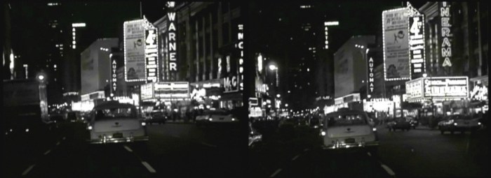 . . . with neon signs advertising “WARNER . . . CINERAMA” . . . curious for a Paramount picture.  [Directly above their taxicab, we see the sign for the old ASTOR Hotel (then owned by Sheraton but demolished a few years later), the coolest building ever to occupy the Square, and recall Bob Dylan’s description of his first night in New York City, in January two years earlier, in a room with its window overlooking Times Square and surrounded by the neon “O” of the “ASTOR” sign.  He took it as a good omen . . . and it surely was.]