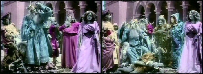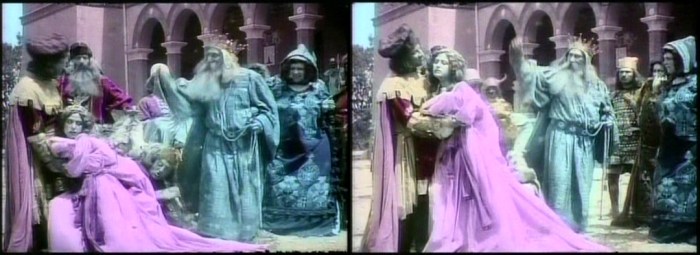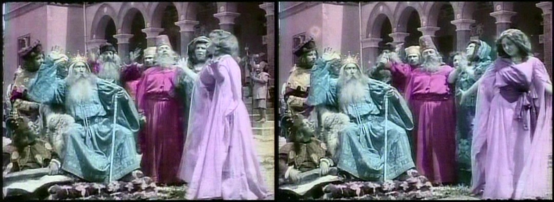 At least two of those films from 1910-1911 survive. Both are adaptations of Shakespeare, “King Lear” and “The Merchant of Venice.” Both were meticulously hand tinted, frame-by-frame, and when viewed (even in still frame) seem miraculously alive to us despite being incomplete and shot in black and white one hundred years ago. These beautiful films give black and white diehards (including yours truly) pause . . .