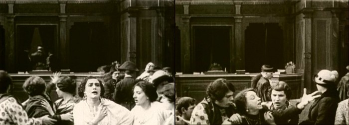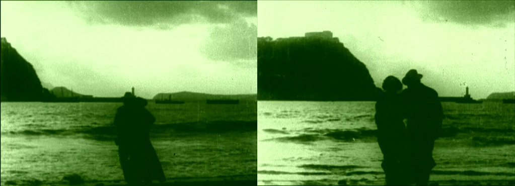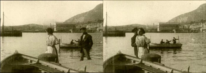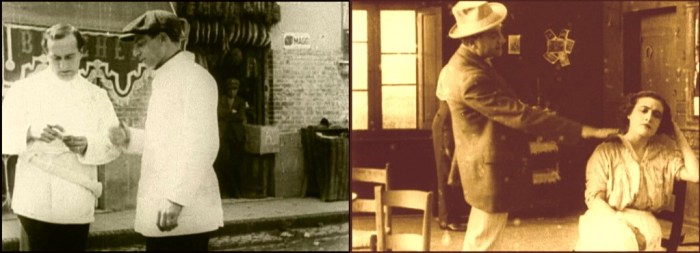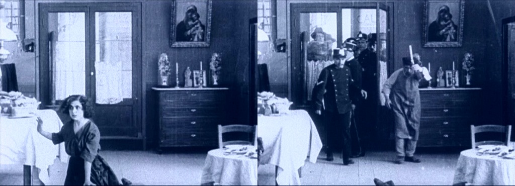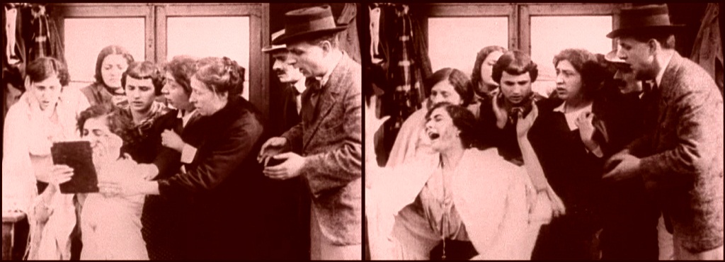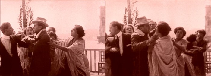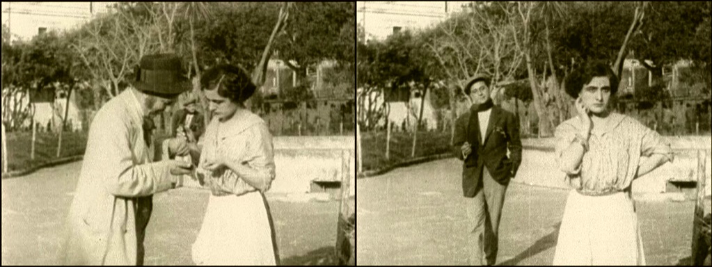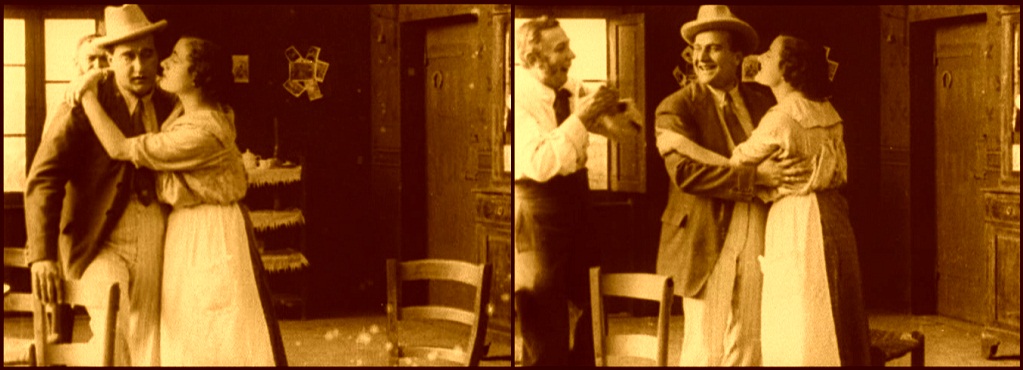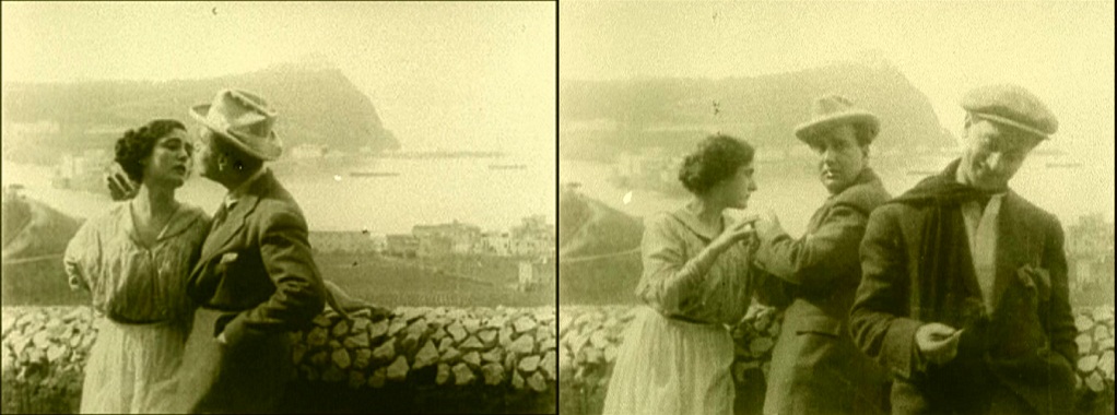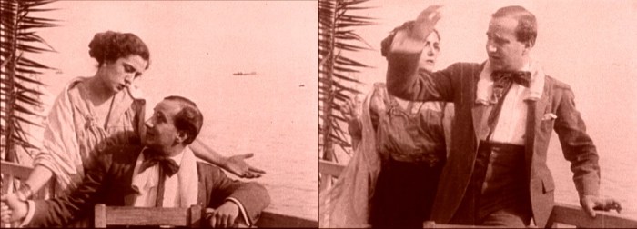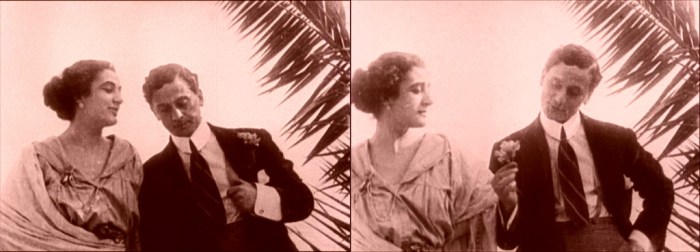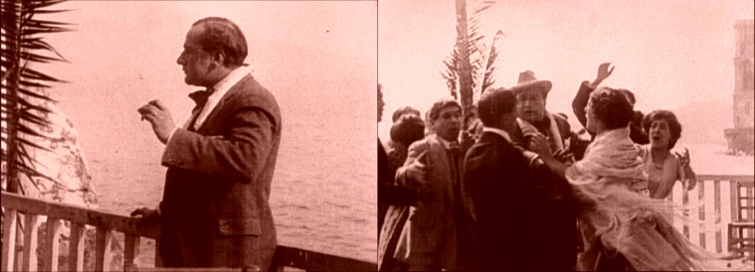 Above, three frames from monochrome tinted fragments of this one-reel film, which does not survive complete in either format.