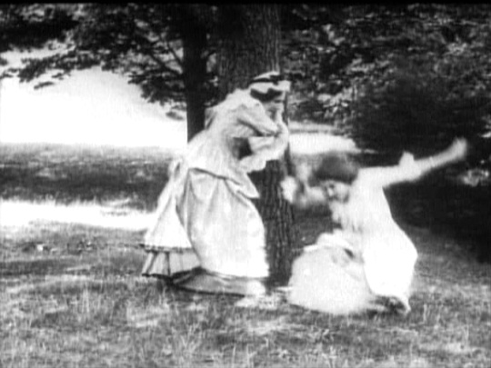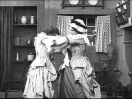 “‘If you two think I’m going to submit to this nonsense you’re very much mistaken,’ I said, and I took off and ran around an apple tree, with Kate Bruce chasing after me till she accidentally stumbled and fell, whereupon I ran back, sat down, and kissed her, and we put our arms around each other. Both the chase and that little embrace remained in the film.” Mary Pickford, Sunshine and Shadow, Doubleday, New York, 1954.