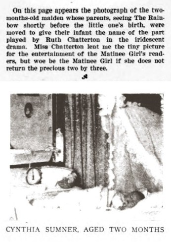 It was also a season in which an unknown teenage actress, after only two and a half years’ professional experience became a star on Broadway in only her second appearance on the Great White Way. A young couple, obvious fans of the theater, and of Miss Ruth Chatterton in particular, named their first child “Cynthia Sumner,” after Miss Chatterton’s character in The Rainbow. It was an event duly reported by the New York Dramatic Mirror’s “Matinee Girl,” complemented by a small photo lent to the columnist by Miss Chatterton.