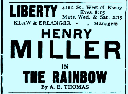 Henry Miller was as respected an actor/director/producer as anyone in American theater of the period. He would produce, direct and star in The Rainbow with his own company. One of Miller’s sons had seen Ruth Chatterton on stage and had recommended her to him for the part of Cynthia Sumner in The Rainbow. Undoubtedly, Miller had read or heard of Ruth Chatterton’s “excessively fragile” voice as described almost six months earlier in the highly influential, if frequently flatulent New York Dramatic Mirror.