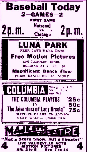 It was during a summer vacation to Washington, D.C. in 1909, visiting friends (and possibly relatives, the Reeds), that Ruth, 16, became entranced by the theater, having spent time backstage at the Columbia Theatre with a friend who was a member of the Columbia Players stock company. Upon a dare from this friend, or another player, she went on stage as an extra in “the chorus” during a scene in a play — a stunt that didn’t go unnoticed.