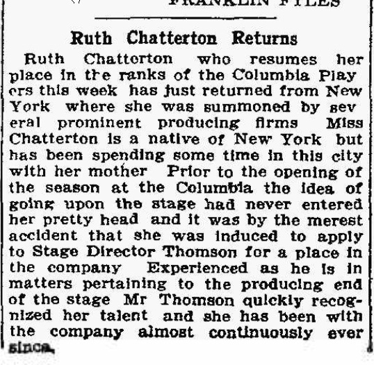 In an interview three years later with the New York Times, Chatterton gave a brief account of her acting career to date. She recalled that having had no prior experience as an actor, she was not looking for a position with the Columbia Players: