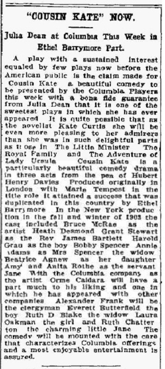Following The Prince Chap was Cousin Kate, also starring Julia Dean, a play originally made famous in the U.S. during its 1903 run that starred Ethel Barrymore, and now being staged in Washington at the Columbia the first week of August, 1909. It was this production that earned Ruth Chatterton her first mention in the press.