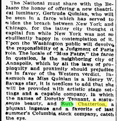 Ruth Chatterton spent the remainder of the season with the Columbia Players and then returned to New York. When she next returned to Washington, during the 1910 season, it was as a member of the Henry W. Savage stock company.