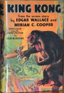 See what I mean?  Great jacket, bare-bones binding (it does include some great two-tone photos on the end papers).  This is a prime example of a photoplay edition that is actually a “novelization” of a movie, a concept that probably originated in an alternate universe where movies existed before books.  A relative bargain at under $700US (others list for ten times that amount).  King Kong, Grosset and Dunlap, 1932, Photoplay first edition, book condition Very Good, dust jacket Near Fine ($699.95US, at AbeBooks.  Other Kong photoplays are also listed, in a range of $395 to $7,995).