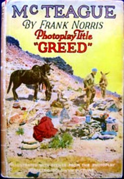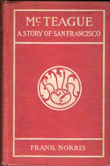 The Photoplay McTeague/Greed is one of those cases where the movie edition with intact dust jacket can often be found for a good deal less than a first edition of the original work.   Six copies of the Photoplay first edition are listed on AbeBooks ranging from $75 to $450, the cheapest being the only one without a dust jacket.  Two are currently listed on Ebay, one for $385 — the one pictured above — and another (without dust jacket) is currently asking $1,625.  Go figure.  By contrast, a first edition, first printing, first issue, of the 1899 Doubleday & McClure McTeague (no dust jacket issued) in good or better condition ranges from around $250 to more than $1,500.  My 1899 first edition, second printing (at right), is one of the highlights of my modest collection.