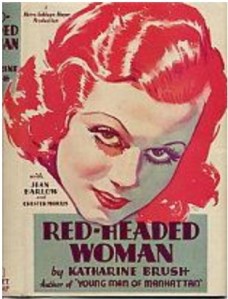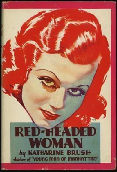 At near right, A 1932 photoplay first edition of the racy 1931 novel by Katharine Brush that Anita Loos adapted for the MGM film that embarrassed Louis B. Mayer and Irving Thalberg, and lead to the enforcement of strict censorship of Ameican movies for the next thirty years.  On the left, not a photoplay 1932 first edition, but a later Grosset and Dunlap reissue without illustrations, it uses the same artwork featuring a fire-engine-red-headed Jean Harlow on the dust jacket at a fraction of the price (but “cheap” is relative, at $85 versus $650 for a photoplay first edition, both listed on AbeBooks).  But still very rare.  Katharine Brush, Red-Headed Woman, Grosset and Dunlap, 1942, Near Fine condition, dust jacket Very Good+, $85; Katharine Brush, Red-Headed Woman, first photoplay edition, Grosset and Dunlap, 1932, Near Fine, dust jacket Fine, $650, both books listed at AbeBooks.