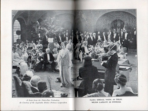By contrast, the photoplay edition published in 1915 by Grosset and Dunlap was bound in a subdued green cloth (that tends to fade to an attractive olive on the spine and edges) with plain artwork, but given a binding sturdier than the original edition.  Far different from most photoplay editions, which tend to be inferior quality compared to the original editions. Unfortunately, my photoplay copy does not have a dust jacket, but I’m not sure it was originally issued with one.  They weren’t commonly issued with books until the 1910s, and the earliest ones were usually rather plain, without elaborate artwork.  This photoplay edition was published in conjunction with the September, 1915 release of the movie adaptation produced by the World Film Corporation, starring Clara Kimball Young as Trilby, and turn-of-the-century stage superstar Wilton Lackaye as Svengali.