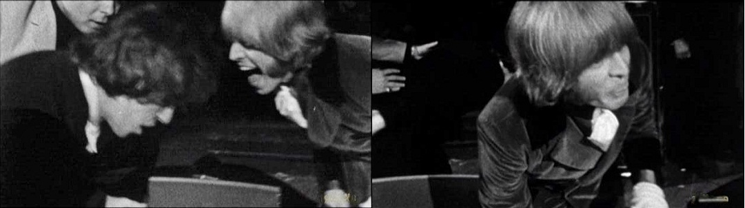 Above: More madness at the Albert Hall: this time it’s Keith Richards’ turn to be saved by security from crazed fans while, Below: Brian Jones has a hearty laugh at his expense . . .