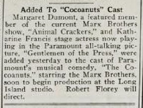 Despite what the press release implies, “Gentlemen” had yet to be completed, much less released. But Kay Francis would make her second film with a group of stage veterans making their first — The Marx Brothers. Francis had shown an aptitude for comedy on stage in Elmer the Great. In The Cocoanuts, an almost literal film adaptation of the Marx’s Broadway musical-comedy hit, Francis would play a straight role.