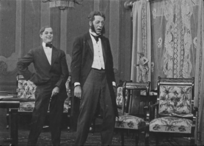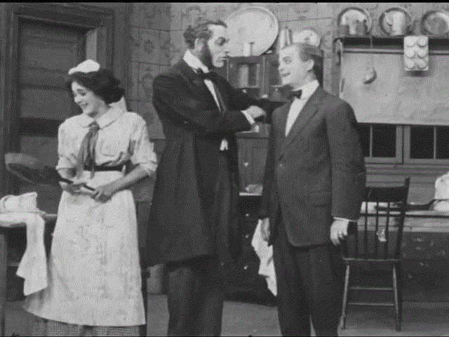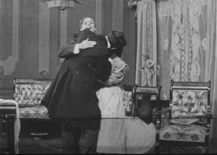 Comparing the placement of furniture and the part in Billy Quirk’s hair between the two shots confirmed my suspicion. How this “mystery piece” got there, and more importantly, how the entire film came to be in its current backward form, I can’t say with absolute certainty. But it was sloppy workmanship somewhere in the reproduction process — at Biograph when preparing the paper print for copyright, or during the LOC’s transfer of the original 35mm paper prints to 16mm film in mid-century. I suspect the former, and a quick peek at that paper print roll would tell the tale.