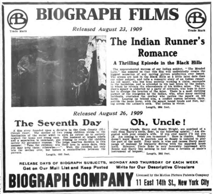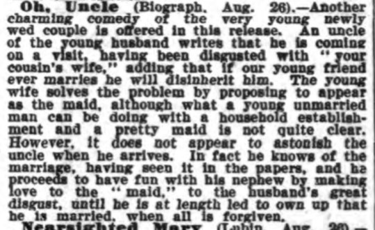 New York NY Dramatic Mirror, 1909 Jun – Aug 1910 (Archives of The New York Dramatic Mirror at fultonhistory.com), for The New York Dramatic Mirror: Review, “Oh, Uncle,” September 4, 1909, p. 17, and Biograph advertisement, August 28, 1909, p. 16.