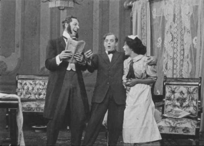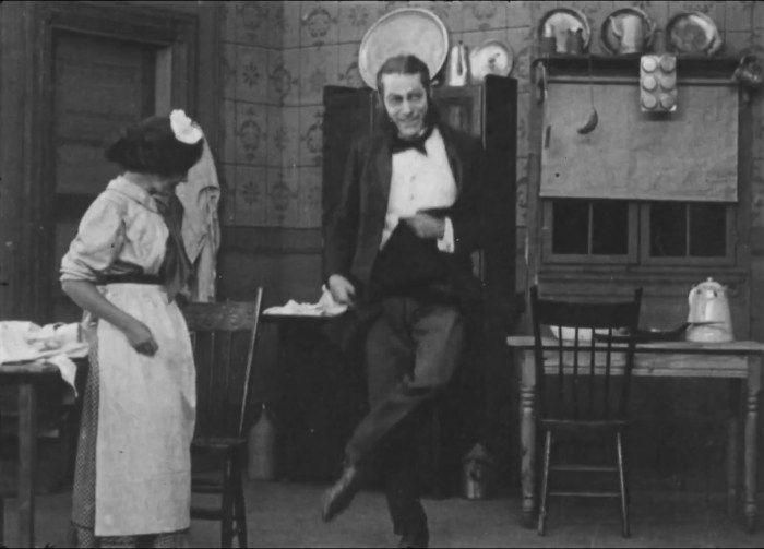 There are no intertitles (Biograph did not include them in the paper copyright prints until later in 1909), but there were apparently at least three (and likely more) in the original release, judging by a jump cut in the middle of an early scene as Bessie is changing into the maid’s clothing while Zeke is arriving, and a couple of later abrupt transitions between scenes in the kitchen and living room.