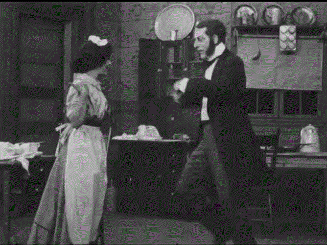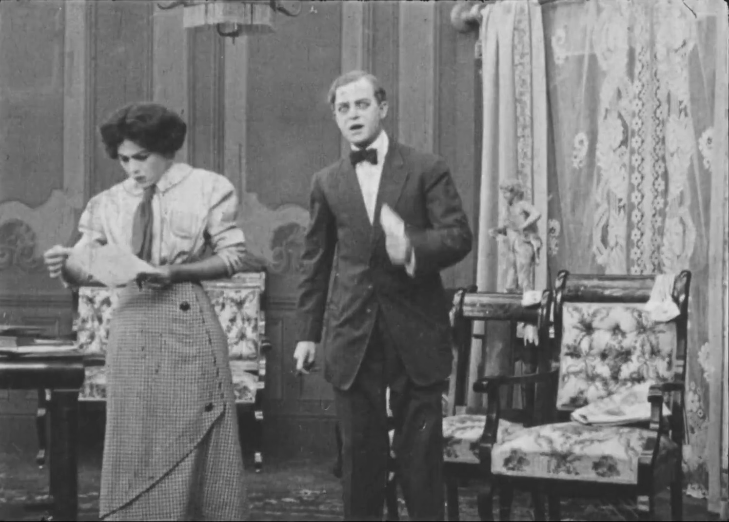 Comparing the placement of furniture and the part in Billy Quirk’s hair between the two shots confirmed my suspicion. How this “mystery piece” got there, and more importantly, how the entire film came to be in its current backward form, I can’t say with absolute certainty. But it was sloppy workmanship somewhere in the reproduction process — at Biograph when preparing the paper print for copyright, or during the LOC’s transfer of the original 35mm paper prints to 16mm film in mid-century. I suspect the former, and a quick peek at that paper print roll would tell the tale.