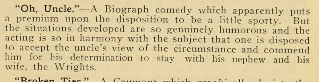 New York NY Dramatic Mirror, 1909 Jun – Aug 1910 (Archives of The New York Dramatic Mirror at fultonhistory.com), for The New York Dramatic Mirror: Review, “Oh, Uncle,” September 4, 1909, p. 17, and Biograph advertisement, August 28, 1909, p. 16.