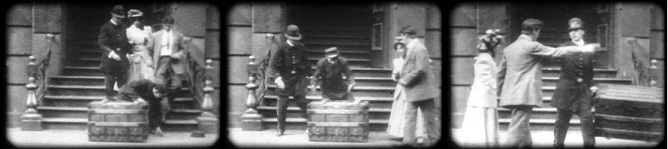 You may have noticed and been attracted or puzzled by the images in the header of this site. If so, they have served their purpose. They are three frame enlargements from “A Calamitous Elopement,” a short (738 feet) film shot in and around 11 East 14th Street in Manhattan on July 9 and 11, 1908. It was the fourth short film made under the direction of D. W. Griffith at the American Mutoscope and Biograph Company. 11 E 14th St was the Company headquarters and film studio. In these three frames shot at the entrance to 11 East 14th St., you see four actors. Arthur Johnson (the tall man in the light suit and Griffith’s first “leading man”), Linda Arvidson Griffith (actress and wife of D.W.), an unknown actor grappling with the trunk, and D. W. Griffith portraying a not-so-friendly NYPD Officer. Frame three likely marks the last time Arthur Johnson, or any actor, gave direction to Mr. Griffith.