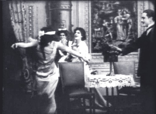 Mary Pickford, Linda Arvidson, frame detail from The Sealed Room. As Linda described in her memoirs, an actor could play a lead role one day, and the next day find themselves “playing ‘atmosphere,’ while [they] decorated the backdrop.” I believe the “decorations” here are discussing what they want to do for lunch. I’ll bet the conversation went something like this . . . Mary: “How ’bout pizza?” Linda: “I had that yesterday.” Mary: “There’s a new Chinese place just off Union Square. Let’s check it out!” Linda: “David and I had Chinese takeout last night . .” Mary: “WHOA! You mean you and Mr. Griffith . . . last NIGHT?” Linda (sheepishly): wellllll . . . I guess I’ve spoiled our little secret.” Mary: YOUR little secret? Let me clue you in — He asked ME to dine with him my first day here, . . . THEN he asked me what I knew about LOVE-MAKING! WTF!!! BELOW: The ladies storm off the set to straighten out Mr. Griffith !!!