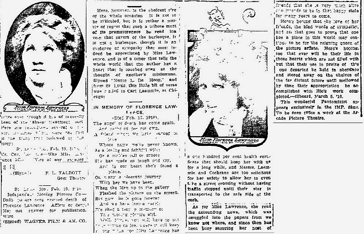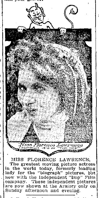 In early summer of 1909, Lawrence and Harry Solter, the actor who had recommended her to Griffith and who was now her husband, were fired by Biograph after it was learned that Lawrence and Solter were negotiating with rival studios while still under contract to Biograph. Producer Carl Laemmle of the Independent Motion Pictures Company, “IMP,” and likely one of those with whom she and Solter were negotiating, planted a false story in newspapers that a certain actress who’s face was familiar to moviegoers had been killed in a streetcar accident. When her broken-hearted fans, who knew her face but not her name, began to write of their grief in letters to newspaper editors, Laemmle unleashed phase two of the plan. He placed ads in newspapers and trade periodicals across the country explaining that not only was the actress alive and well, her name was Florence Lawrence and she had just signed with IMP and could be seen exclusively in their upcoming releases.