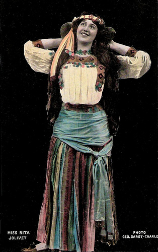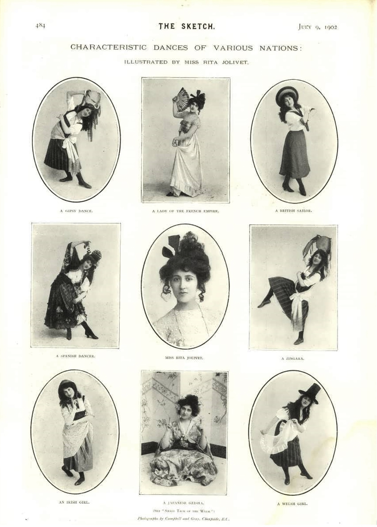 Rita Jolivet featured in a kaleidoscope of poses in the English Sketch magazine, July 1902, by which time Jolivet was already a popular stage performer in London. These photos also seem to be proof that, contrary to her claims, she was not born in 1890: she is clearly older than twelve. An earlier birth date of around 1885 would be a reasonable assumption.