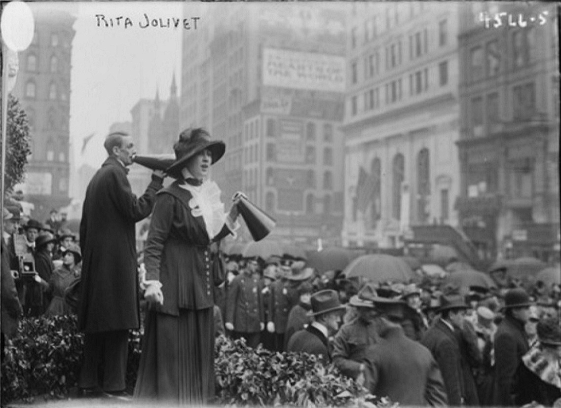 In April of 1918, Rita Jolivet and D. W. Griffith were chosen by the National Liberty Loan Committee as chairpersons to issue appeals to screen actors and screen directors, respectively, to subscribe to the Liberty Loan drive. In the following weeks and months, Jolivet would travel among the eastern cities — as well as smaller communities — of the U. S. to appeal to the public to buy Liberty bonds. Appearing in New York, Philadelphia and Baltimore, she addressed throngs at theaters and at open-air public venues. In Shamokin, a smaller city in eastern Pennsylvania, she spoke to a local theater audience: