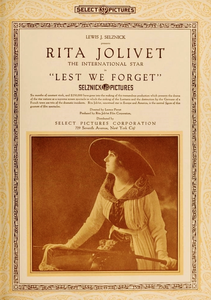 “Reports of the success of ‘Lest We Forget,’ the world war love drama produced some time ago by the Rita Jolivet Film Corporation, and now being distributed through Metro exchanges are gratifying to those financially interested in the production. The feature was the attraction at the Regent theater, Toronto . . . and broke all previous records at the house. Rita Jolivet, star of the picture, appeared in person . . . and aroused enthusiasm with her patriotic speeches. Miss Jolivet is a great favorite in Canada. More house records were smashed by the picture in Waterbury, Conn., . . and in the Loew houses in New York City the following week.” The Moving Picture World, May 4, 1918.