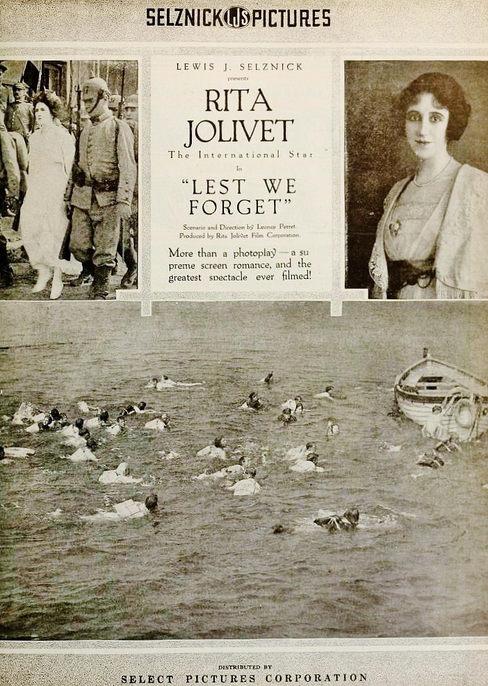 Contrary to the opinion of Variety, Lest We Forget, picked up for distribution after its première by Metro Pictures (of which Louis B. Mayer was a founding partner), would perform quite well across the U. S. and Canada for nearly two years. And it would make money for a much different purpose — as a great propaganda vehicle, with Rita Jolivet appearing at screenings of the film as she toured the States in a Liberty Bond drive that netted millions for the war and relief efforts.