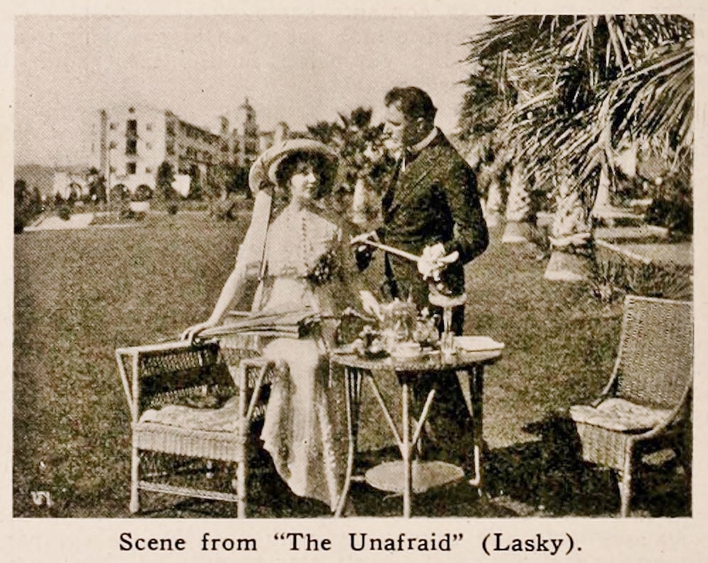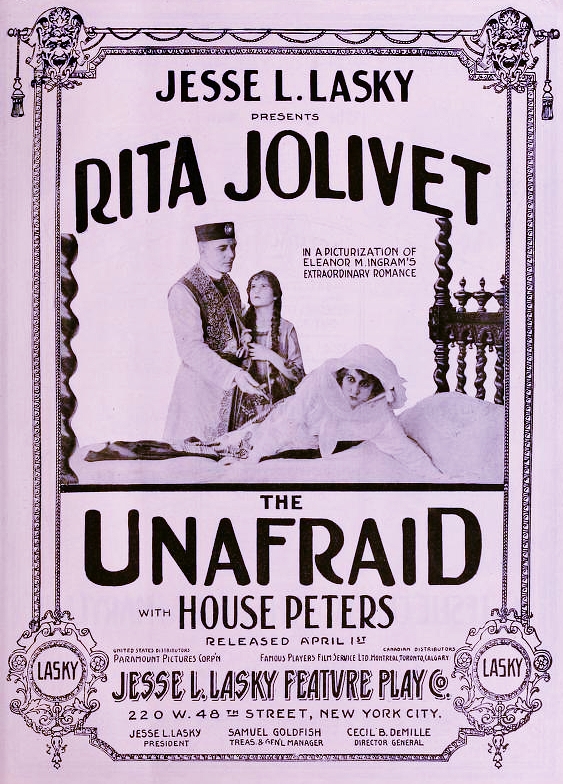 Cecil B. DeMille had been named Director General of the Famous Players California division, and in 1913 established a studio in Los Angeles, That same year he produced the first feature film made entirely in California, The Squaw Man. DeMille directed about a dozen more in 1914 before 1915’s The Unafraid in which Rita Jolivet — now famous in America from her work on Broadway — appeared opposite House Peters and Theodore Roberts in a tale of a wealthy American heiress who becomes involved with two Balkan noblemen who turn out to be brothers.