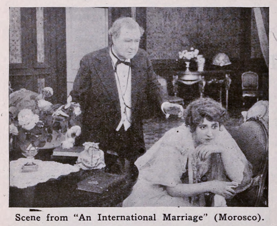 Her next film project brought her back across the Atlantic to the U. S. and Famous Players in Southern California to make An International Marriage with the Morosco production company, part of the Famous Players-Lasky unit. The story was of the romance of a European nobleman and an untitled daughter of a coarse American businessman (were there any other kind in early motion pictures?), and the obstacles they encounter on the road to wedded bliss (including a sham marriage with a pre-arranged divorce to another Count to “legitimize” the American girl’s status as titled nobility so she can then marry her true love. Whew!!).