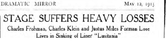 On May 7, 1915, a German U-boat torpedoed the Cunard liner, the HMS Lusitania off the coast of Ireland. Over two-thirds of the nearly 2,000 persons aboard the ship were lost, approximately the same ratio as Titanic. But unlike Titanic which remained stable before sinking, the Lusitania capsized, preventing any lifeboats from being deployed, and sank in 18 minutes (versus 2 1/2 hours for Titanic). (Also unlike Titanic, vessels nearby were able reach the scene soon enough to prevent the loss of life from being even worse.) Among the casualties was the most prominent producer in American and British theater, Charles Frohman.