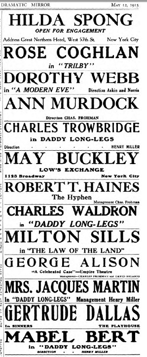 “Not many of us were present last evening at the performance . . The comparative vacuum in front of this popular bit of fiction may be explained by the fact that “Daddy Longlegs” existed here prosperously a year or two ago for twenty-five weeks, and that all of us, so inclined, witnessed [the play]. Still, the presence in the cast of such an eminent star and such a sane actor as Mr. Miller . . should have inspired more interest than it seems to have done. . . The company acting “Daddy Longlegs” at Powers’ is of the best. Percy Hammond, Chicago Daily Tribune, May 4, 1916.