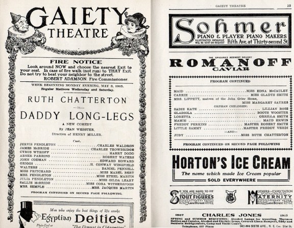 BELOW: The Gaiety Theatre program for the week beginning Monday Evening, May 3, 1915, the next-to-last week of Daddy Long-Legs on Broadway for the 1914-15 theater season. Charles Waldron, as “Jervis Pendleton,” was one of five actors (Frederick Truesdell, Guy Standing, George Alison and Henry Miller were the others) to portray the character during its three seasons, including several different touring companies, from 1914 to 1916. Three actresses, Renee Kelly, Frances Carson and Ruth Chatterton played the role of “Judy Abbott.”
