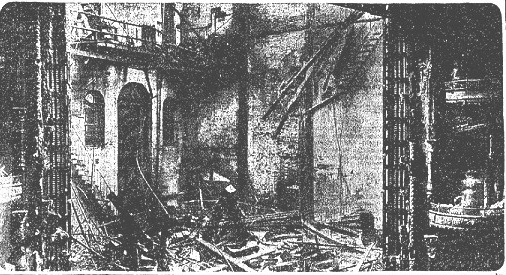 The Tremont Theatre stage in ruins. As the fire was gradually brought under control, one of the firemen quipped, “‘The Hose’ is the last thing that will be played here this season.” The Boston Globe, January 24, 1916.