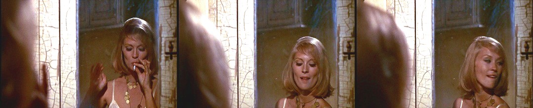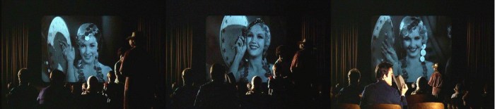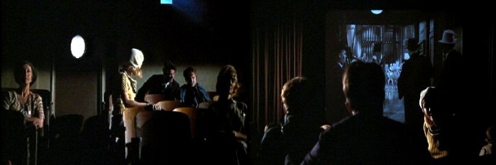 . . . a stark contrast to the mood of Clyde and C.W. (Michael J. Pollard) in the dark theater lit by the blue-sliver screen and the girls of “Gold Diggers.”