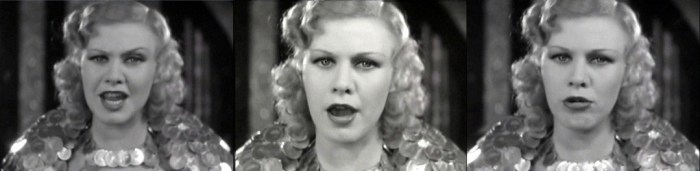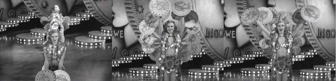 ABOVE: Ginger Rogers won't let Old Man Depression get her (or us) down as she tears into "We're in the Money" in the opening shots of "Gold Diggers of 1933," WB 1933, directed by Mervyn LeRoy. BELOW: Surrealism hits American movies thirty years before the Psychedelic Sixties as Ginger reprises "We're in the Money" in EXTREME close-up . . . IN PIG LATIN!