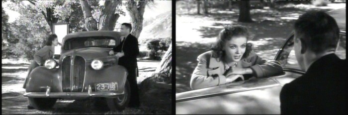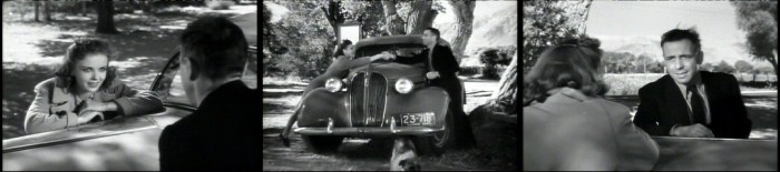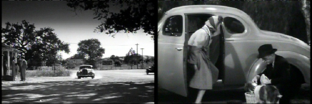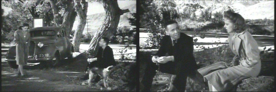 These shots of Roy and Marie with their car at the rest stop (also in the next set below) foreshadow eerily the more relaxed moments along the road in another film about a different pair of criminals on the run. Real life contemporaries of the fictional character Roy Earle, their brief lives outside the law were depicted in a film made almost thirty years later — “Bonnie and Clyde.”
